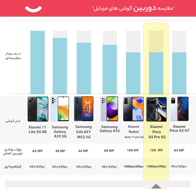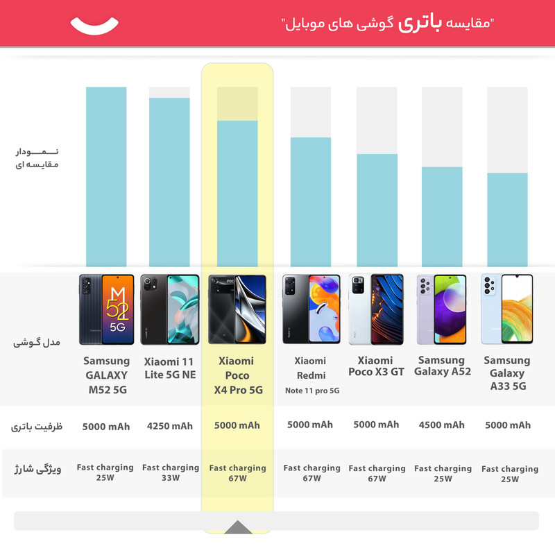 سری پوکو گوشیهای هوشمند میانرده شرکت شیائومی با توجه به قیمت در نظر گرفته شده به مشخصات فنی مناسب و کاملا قابل قبولی مجهز شدهاند و در بین کاربران محبوبیت بالایی دارند. یکی از گوشیهای میانرده و باکیفیت این سری، شیائومی Poco X4 Pro 5G است که در جایگاه یک گوشی میانرده به مشخصات فنی مناسبی مجهز شده است. در نمای روبهرویی این گوشی از صفحهنمایش با ابعاد 6.67 اینچ و رزولوشن 1080×2400 پیکسل از نوع سوپر امولد بهره برده است. این صفحهنمایش با توجه به توانایی نمایش 395 پیکسل در هر اینچ و نرخ بروزرسانی 120 هرتز، عملکرد بسیار خوب و باکیفیتی را بهشما ارائه میکند. در قسمت پشتی یک سنسور دوربین اصلی قدرتمند با رزولوشن 108 مگاپیکسل از نوع عریض در کنار سنسور 8 مگاپیکسلی از نوع فوق عریض (ultrawide) و سنسور 2 مگاپیکسل ماکرو، سنسورهای دروبین سهگانه Poco X4 Pro 5G را تشکیل میدهند. برای دوربین سلفی هم سنسور با رزولوشن 16 مگاپیکسل در نظر گرفته شده است. در بخش مشخصات سختافزاری هم حضور پردازنده اسنپدراگون 695 5G شرکت کوالکام سبب شده تا این گوشی عملکرد قابل قبولی را در اجرای بازیهای حتی سنگین همانند آسفالت 9 داشته باشد. البته نباید فراموش کنیم که به لطف حضور این پردازنده، Poco X4 Pro 5G توانایی پشتیبانی از شبکههای اینترنتی پرسرعت نسل پنجم یا همان 5G را هم دارد. باتری قدرتمند با میزان ظرفیت 5000 میلیآمپرساعت در کنار شارژر 67 وات مجهز به تکنولوژی شارز سریع (توانایی شارژ صفر تا صد درصدی در مدت زمان 41 دقیقه) از دیگر مشخصات در نظر گرفته شده برای این گوشی هوشمند میانرده هستند.