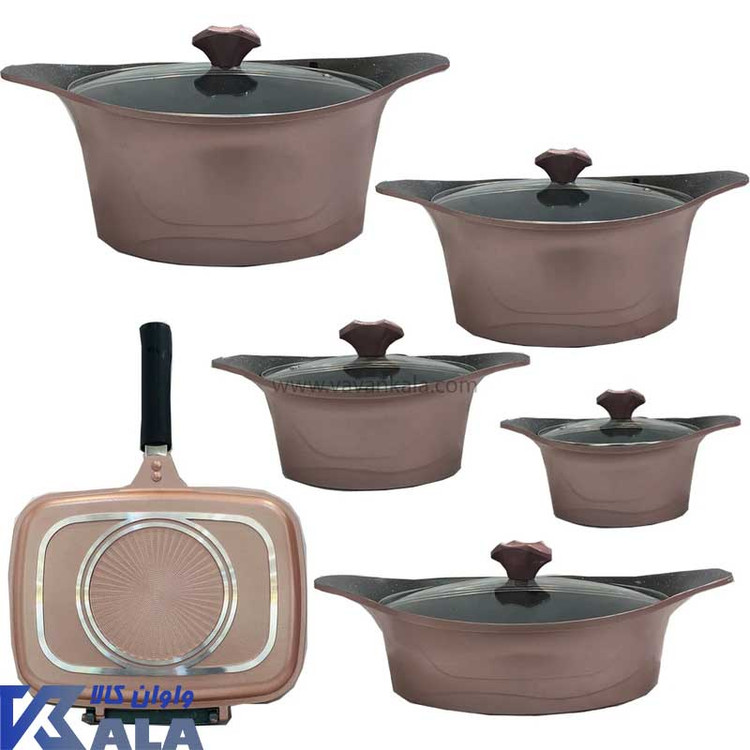تعداد قابلمه ها طوری طراحی شده که با خرید یک سرویس دیگر نیازی به خرید هیچ قابلمه ای در خانه احساس نمی شود,پوشش داخلی از جنس گرانیت نچسب و پوشش بیرونی رنگ کوره ای و مقاوم در برابر ضربه و حرارت میباشد که عمر طولانی را برای قابلمه های شما به ارمغان میاورد,دسته های قابلمه از جنس خود قابلمه بوده که این قابلیت باعث شده دستگیره ها روی حرارت آسیب نبینن,همچنین میتوان از قابلمه ها داخل فر نیز استفاده نمود.
