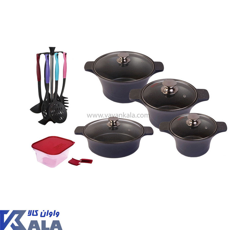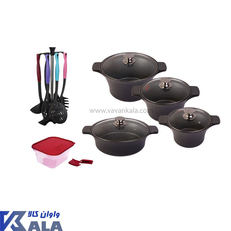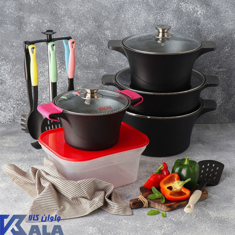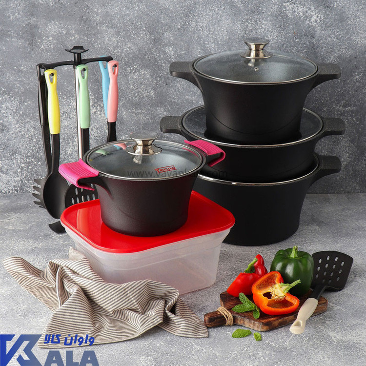 سرویس پخت و پز 18 پارچه تکنو مدل آناهیتا شامل 3 عدد قابلمه در سایز های 20، 24 و 28 می باشد. همچنین یک تابه دو دسته سایز 28 ، و یک ست هفت پارچه کفگیر و ملاقه به انضمام یک جفت دستگیره سیلیکونی نسوز در این سرویس قرار گرفته شده است. جنس پوشش درونی تابه ها و قابلمه های این سرویس تمام از گرانیت نچسب می باشد. رنگ بدنهی داخلی این سرویس طوسی رنگ است و تفکیک رنگی آن براساس بدنهی خارجی صورت میگیرد. ضخامت کف تمامی ظروف به گونه ای طراحی شده است که انتقال حرارت به صورت کاملا یکنواخت انجام میشود؛ درنتیجه مواد غذایی یکدست پخته میشوند. درپوشهای این ست از شیشه هستند و با رینگ استیل پوشیده شدهاند و برای خروج بخار از ظروف یک سوپاپ ریز روی آنها تعبیه شده است. در کنار این ظروف یک ظرف پلاستیکی با درب جهت نگهداری مواد غذایی در یخچال و خارج از آن قرار داده شده است. برای اینکه سطح داخلی ظروف شما برای مدتهای طولانی سالم و بدون خش بماند، تلاش کنید که همیشه از ابزارهای آشپزی مناسب برای این ظروف استفاده کنید.
